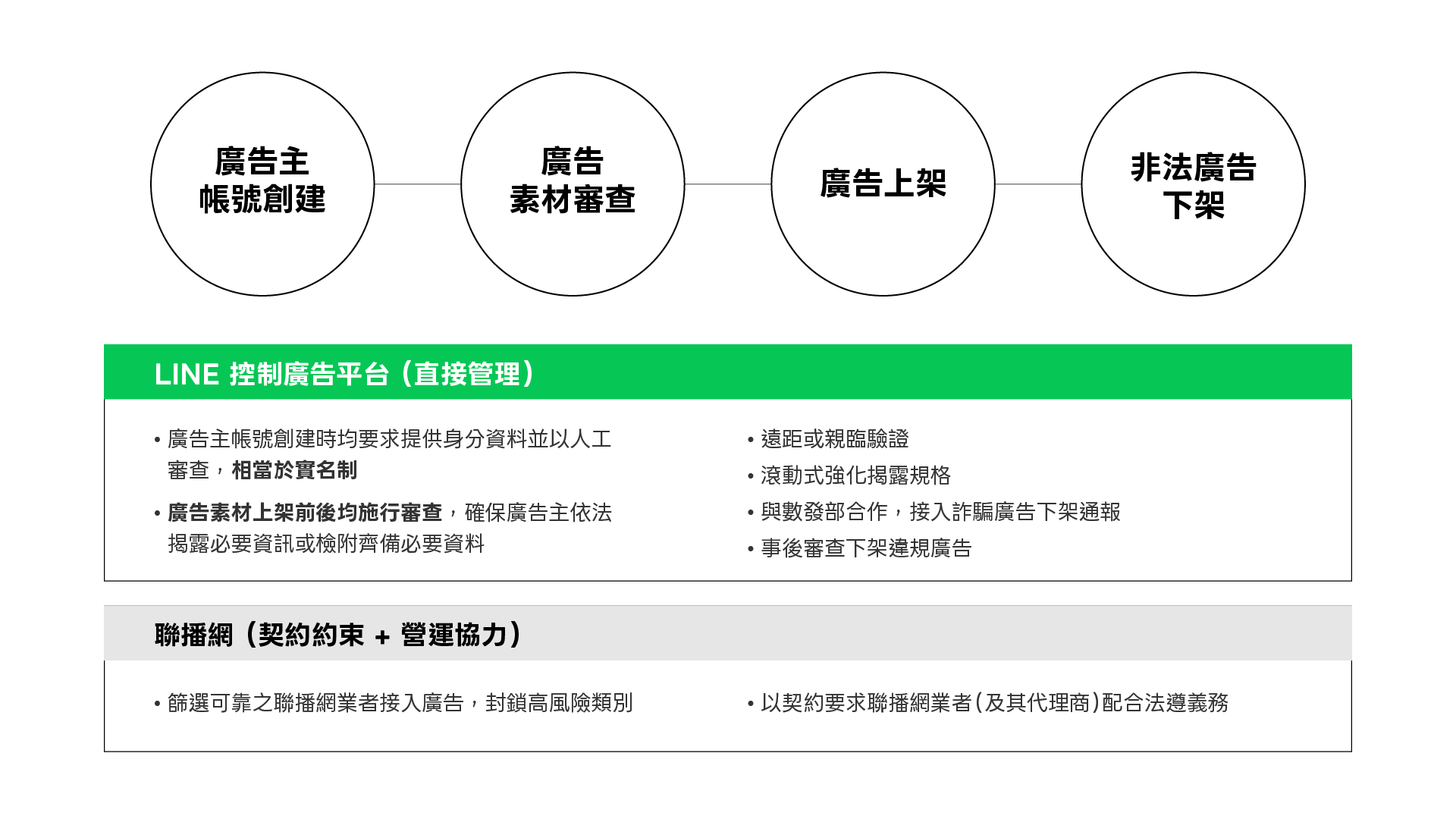LINE 廣告系統係以親臨驗證或遠距驗證方式,於廣告主帳號創建時實施廣告主身分驗證,並以人工方式審查帳號創建時所提交之資料。